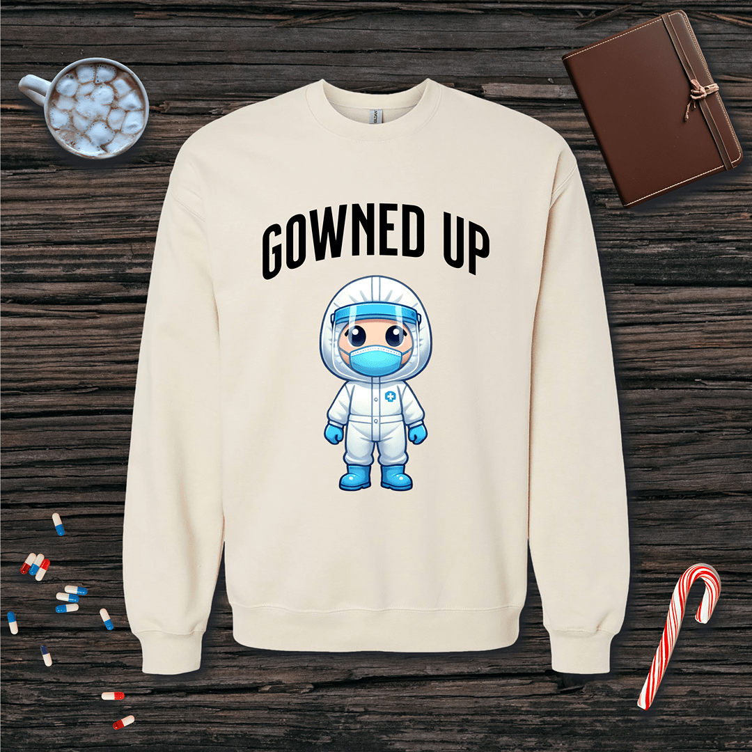 Compounding Pharmacy Tech Gowned Up Fleece Crewneck Sweatshirt
